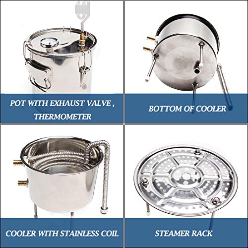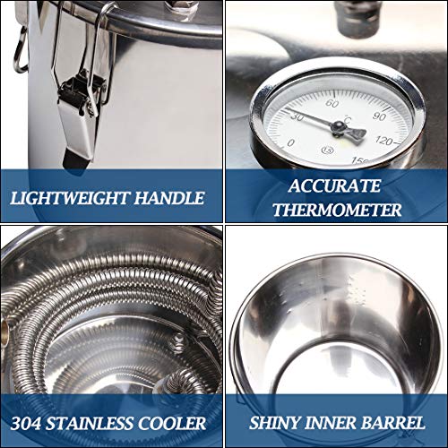4. DESIGN SPECIALE – Questo distillatore professionale ha 2 fori sul coperchio, uno per il termometro, l’altro per il dispositivo di raffreddamento (per distillare l’acqua pura) o la valvola di scarico (per distillare il vino), può impedire all’apparecchiatura di perdere aria.