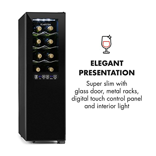 cantinetta frigo per vini eco-sostenibile con 45 litri in volume per 16 bottiglie | sei ripiani in metallo estraibili e illuminazione interna LED attivabile | frontale in vetro con doppio isolamento, schermo LCD con indicazione temperatura e sensibile pannello di controllo touch