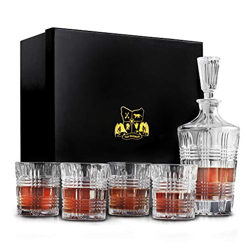 Decanter per whisky splendidamente realizzato con tappo e 4 bicchieri. Il decanter contiene 750 ml. Ogni bicchiere a base pesante contiene 300 ml ed è abbastanza grande per ospitare pietre da whisky da 5,1 cm, cubetti o sfere di ghiaccio. La vetreria Van Daemon è lavabile in lavastoviglie.