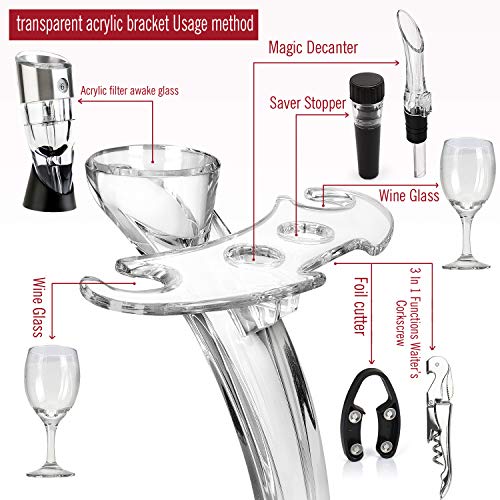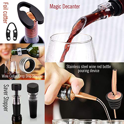 ACCESSORI PER IL VINO DA 8 PEZZI: Include tutti gli accessori necessari, 1 cavatappi per vino, 1 tappo per vino, 1 versatore vino, 1 anello per vino, 1 tagliacarte per vino, 1 decanter per vino, 1 porta bicchiere per vino, 1 supporto per decanter per vino
